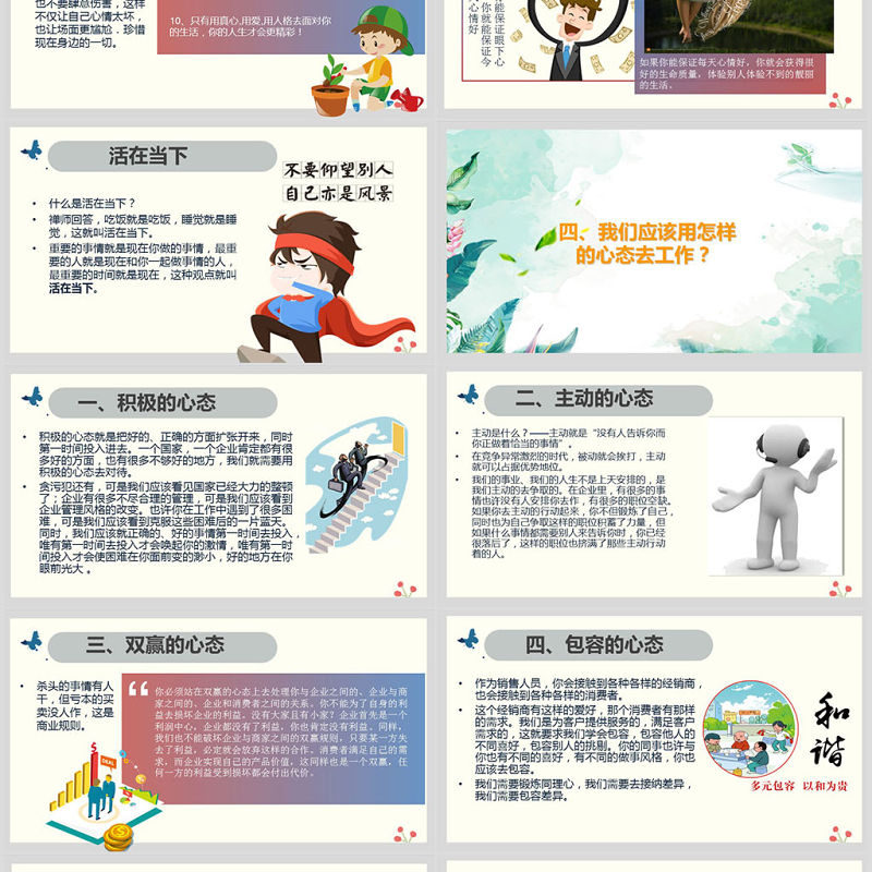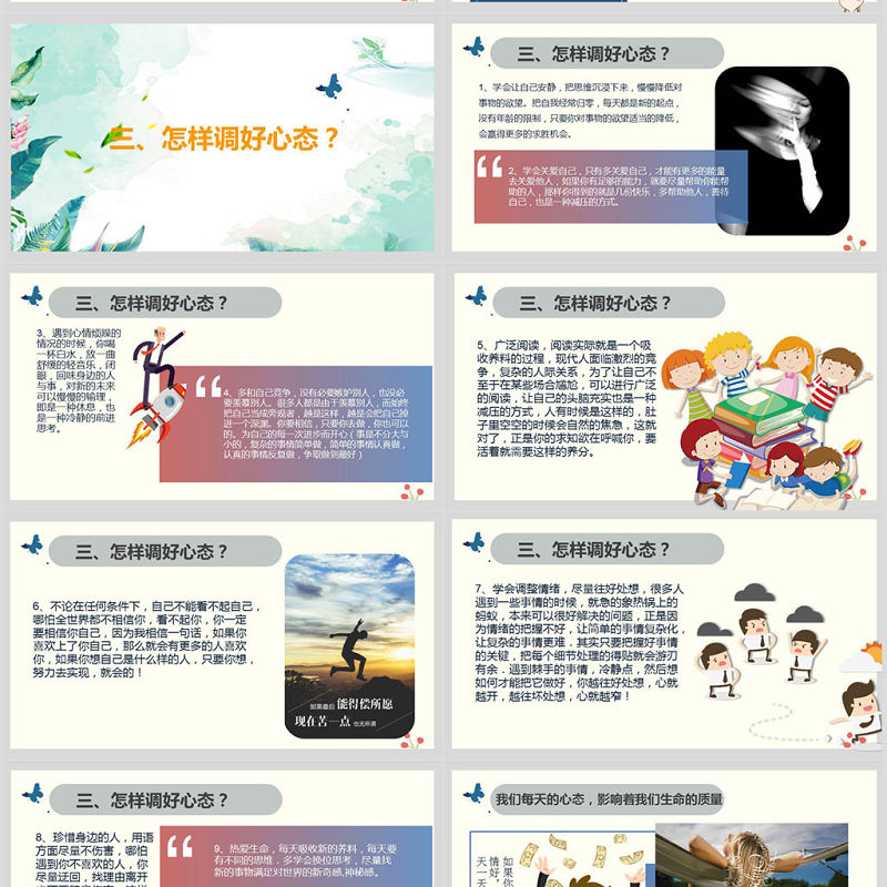 三、怎樣調好心態?8、珍惜身邊的人,用語方面盡量不傷害,哪怕遇到你不喜歡的人,你盡量迂回,找理由離開也不要肆意傷害,這樣不僅讓自己心情太壞,也讓場面更尷尬.珍惜現在身邊的一切。 10、只有用真心,用愛,用人格去面對你的生活,你的人生才會更精彩!