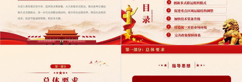 1總體要求目錄CONTENTS2提升多式聯(lián)運(yùn)承載能力和銜接水平3創(chuàng)新多式聯(lián)運(yùn)組織模式4促進(jìn)重點(diǎn)區(qū)域運(yùn)輸結(jié)構(gòu)調(diào)整5加快技術(shù)裝備升級(jí)6營(yíng)造統(tǒng)一開(kāi)放市場(chǎng)環(huán)境7完善政策保障體系