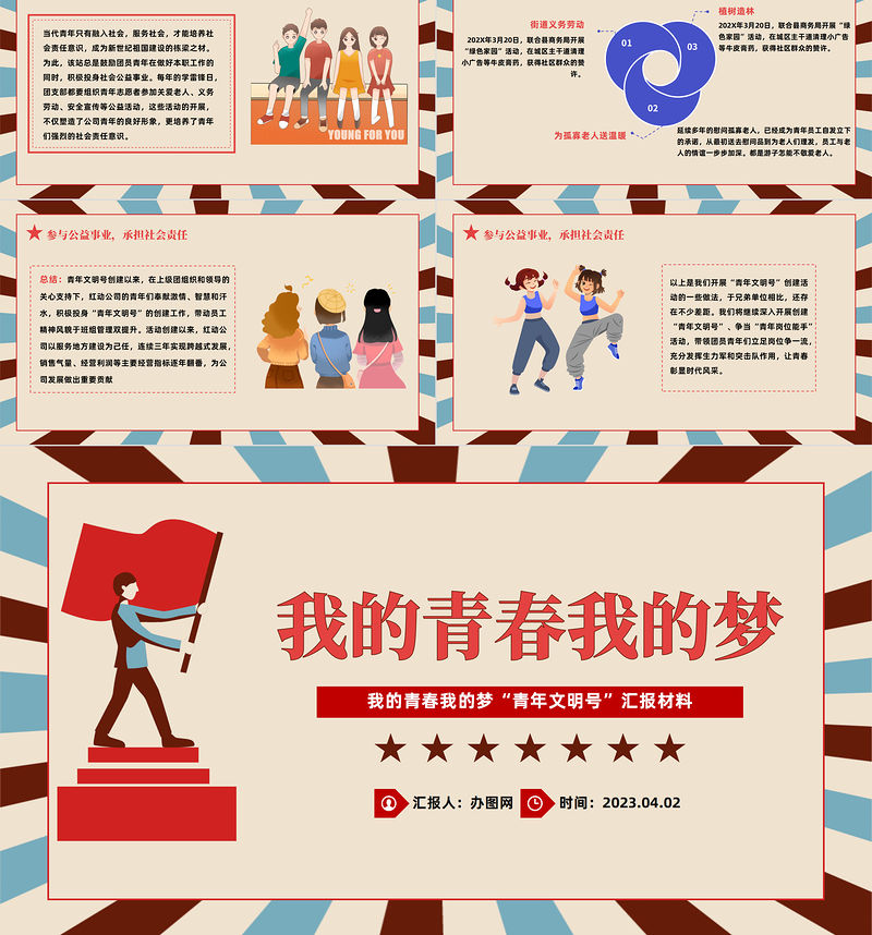 2023我的青春我的夢PPT時(shí)尚卡通風(fēng)青年文明號匯報(bào)材料課件模板下載 Array