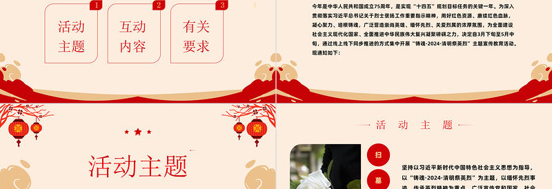 前言今年是中華人民共和國成立75周年,是實現“十四五”規劃目標任務的關鍵一年。為深入貫徹落實習近平總書記關于烈士褒揚工作重要指示精神,用好紅色資源、賡續紅色血脈,凝心聚力、培根鑄魂,廣泛營造崇尚英雄、緬懷先烈、關愛烈屬的濃厚氛圍,為全面建設社會主義現代化國家、全面推進中華民族偉大復興凝聚磅礴之力,決定自3月下旬至5月中旬,通過線上線下同步推進的方式集中開展“鑄魂·2024·清明祭英烈”主題宣傳教育活動。現通知如下: