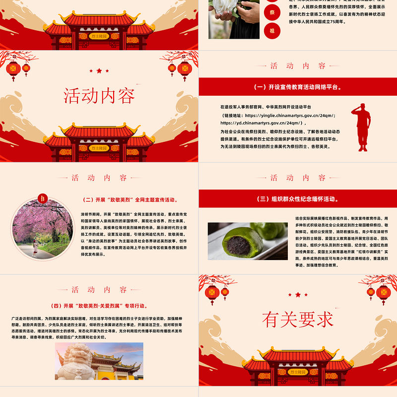 有關要求此次宣傳教育活動覆蓋面廣、內容豐富,各地各部門要各司其職、通力協作、齊抓共管,切實提升主題宣傳教育實效。退役軍人事務部門要會同相關部門謀劃落實具體措施,清明節期間要聯合公安、應急管理、消防等部門和軍隊有關單位走訪慰問烈屬。網信部門要引導互聯網媒體配合做好主題宣傳教育活動,唱響主旋律、傳播正能量。各部門要發動各界群眾、企事業單位、社會組織參與褒揚紀念活動,擴大傳承英烈精神的陣地。(一)加強統籌協調。