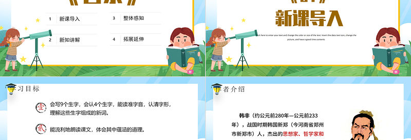相關知識《韓非子》內容共二十卷,分為五十五篇,總字數達十多萬言。本課選自《五蠹》篇。值得一提的是,《韓非子》書中記載了大量膾炙人口的寓言故事,最著名的有“自相矛盾”“守株待兔”“諱疾忌醫”“濫竽充數”“老馬識途”等等。這些生動的寓言故事,蘊含著深雋的哲理,憑著它們思想性和藝術性的完美結合,給人們以智慧的啟迪,具有較高的文學價值。