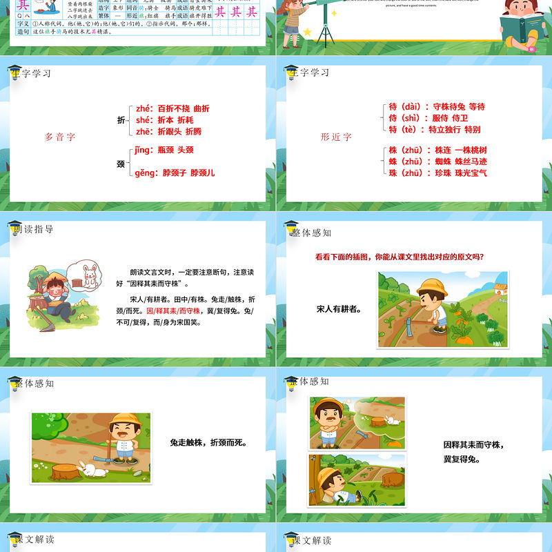 課文解讀讀課文,結合注釋和插圖理解課文的意思,用自己的話說一說課文講了一個什么故事。從前,宋國有一個農夫在田地里耕作,忽然從遠處跑來一只兔子,它一不小心就撞在田地里的樹樁上死了。農夫很高興。于是他放下農具整天守在那棵樹樁旁,希望能再撿到兔子,結果卻一無所獲,還被宋國人笑話。