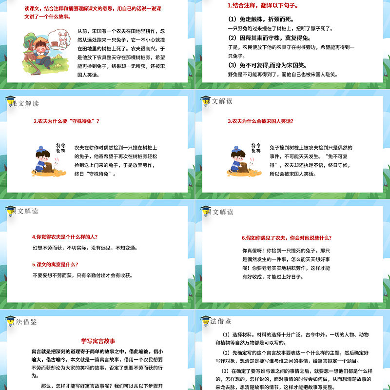 課文解讀 2.農夫為什么要“守株待兔”?農夫在耕作時偶然撿到一只撞在樹樁上的兔子,他寄希望于再次在樹樁旁輕松撿到送上門來的兔子,于是放棄勞作,終日“守株待兔”。