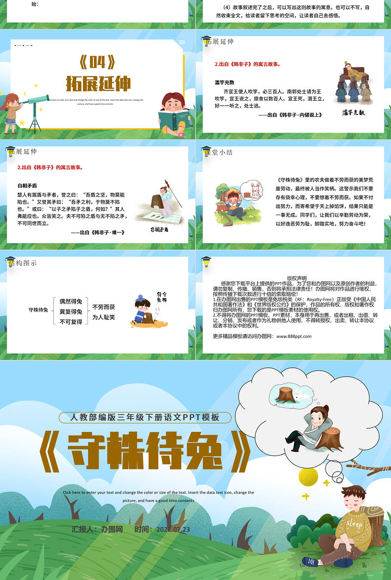 Click here to enter your text and change the color or size of the text. Insert the data text icon, change the picture, and have a good time.contents人教部編版三年級下冊語文PPT模板《守株待兔》匯報人:辦圖網 時間:2022.07.23