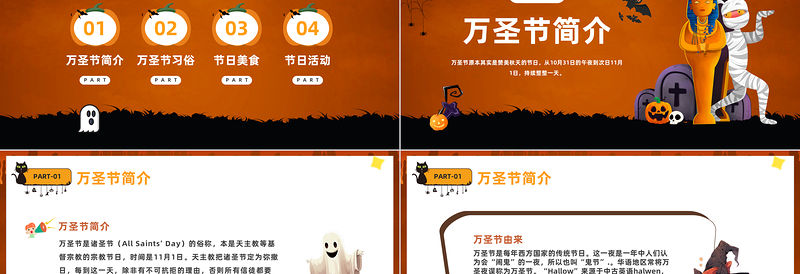 萬(wàn)圣節(jié)原本其實(shí)是贊美秋天的節(jié)日,從10月31日的午夜到次日11月1日,持續(xù)整整一天。PART-02萬(wàn)圣節(jié)習(xí)俗
