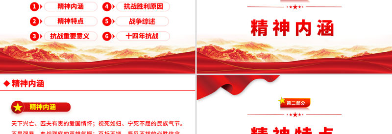 目錄CONTENTS1精神內涵2精神特點3抗戰重要意義4抗戰勝利原因5戰爭綜述6十四年抗戰