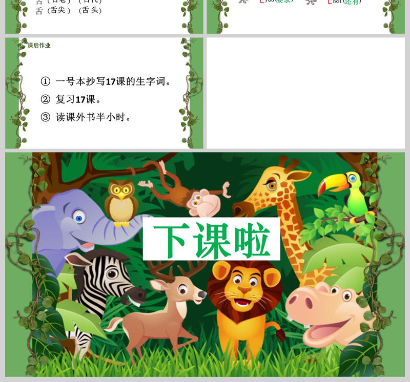 一號本抄寫17課的生字詞。 復習17課。 讀課外書半小時。課后作業(yè)