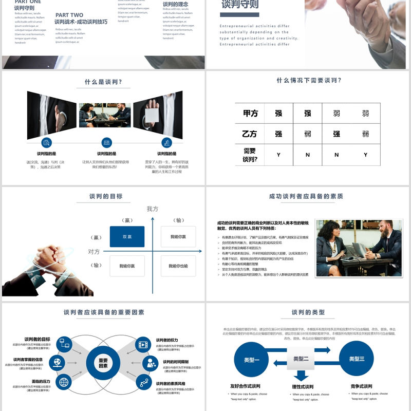 類型一 類型三 類型二When you copy & paste, choose "keep text only" option.When you copy & paste, choose "keep text only" option.When you copy & paste, choose "keep text only" option.友好合作式談判理性式談判競爭式談判單擊此處編輯您要的內容,建議您在展示時采用微軟雅黑字體,本模版所有圖形線條及其相應素材均可自由編輯、改色、替換。單擊此處編輯您要的內容單擊此處編輯您要的內容,建議您在展示時采用微軟雅黑字體,本模版所有圖形線條及其相應素材均可自由編輯、改色、替換。單擊此處編輯您要的內容