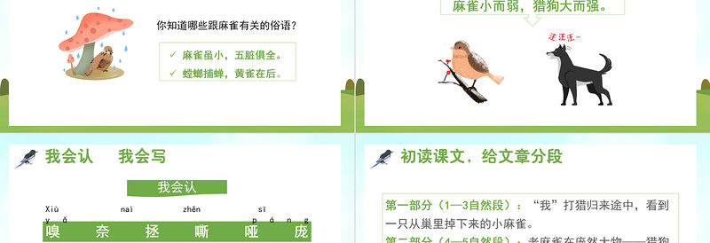 第一部分(1—3自然段):“我”打獵歸來途中,看到一只從巢里掉下來的小麻雀。 第二部分(4—5自然段):老麻雀在龐然大物——獵狗面前,奮不顧身地保護小麻雀。 第三部分(6—7自然段):小麻雀得救了,“我”帶走了獵狗。初讀課文,給文章分段