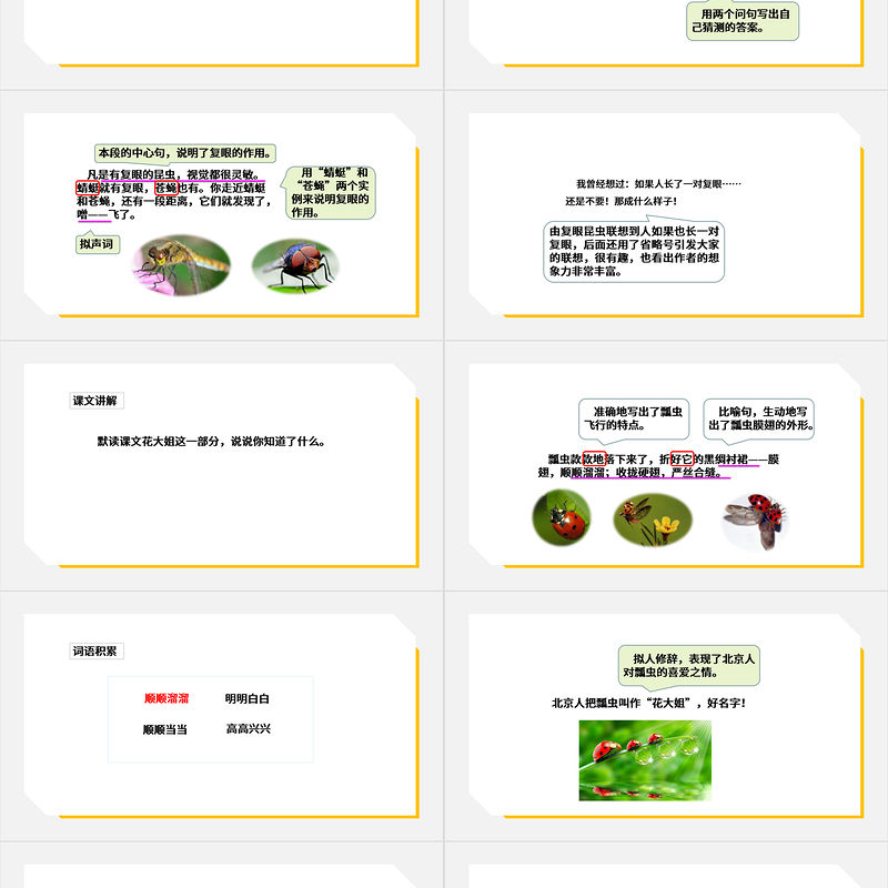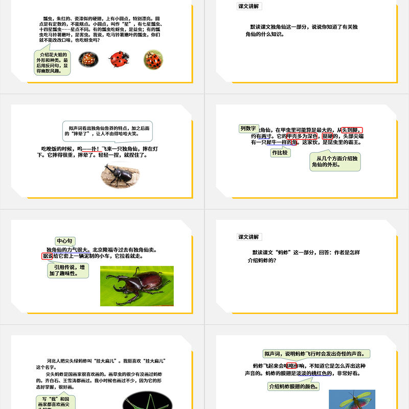 課文主題 這篇課文作者以昆蟲的特征為描述對象,側重記敘了復眼、花大姐、獨角仙、螞蚱這幾類昆蟲。表達了作者對昆蟲的喜愛之情和對大自然的熱愛。