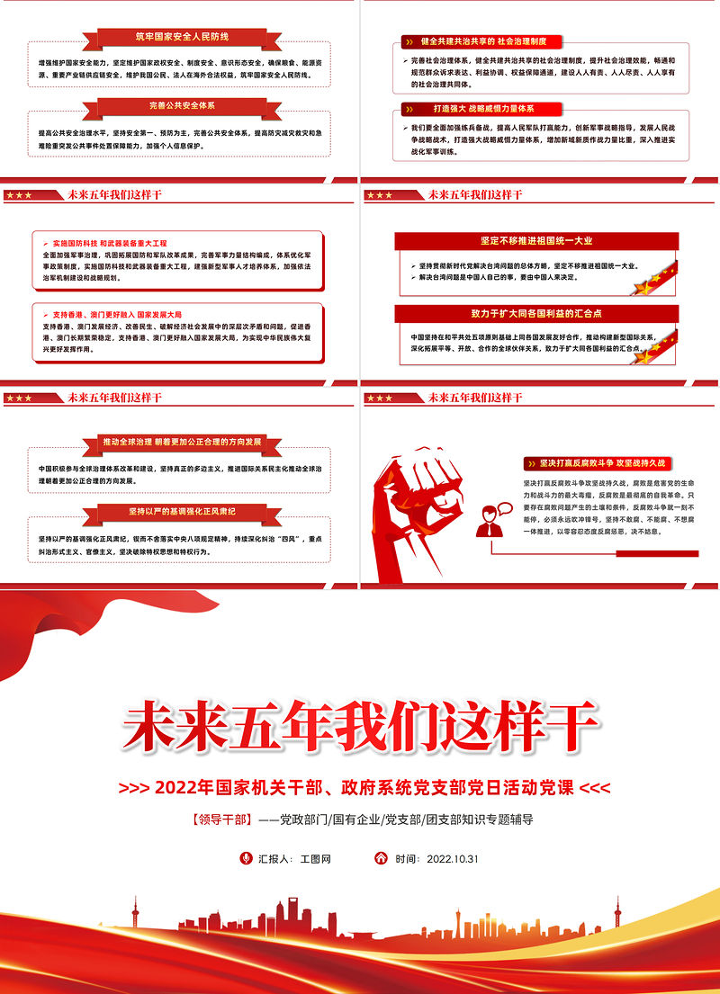 工圖網提供2022未來五年我們這樣干PPT紅色黨政風國家機關干部黨支部黨日活動專題黨建黨政課件模板供會員免費下載。更多精彩黨課PPT素材,盡在工圖網。