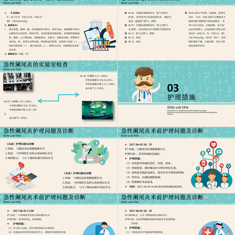 Slide sub title急性闌尾炎術前護理問題及診斷2017-06-05 11:00P2 焦慮 :與環境陌生及擔心疾病預后有關護理目標:患者的焦慮、恐懼減輕。護理措施 :(1)多與病人溝通,有針對性的進行心理疏導。(2)介紹病區環境及管床醫生護士,消除對環境的陌生感。(3)幫助同病室患者之間建立良好的關系。(4)與家屬充分溝通講解手術可能取得的效果,介紹成功案例, 消除患者的緊張心理。評價:2017-06-05 20:00患者及家屬的焦慮程度明 顯減輕,積極配合治療。