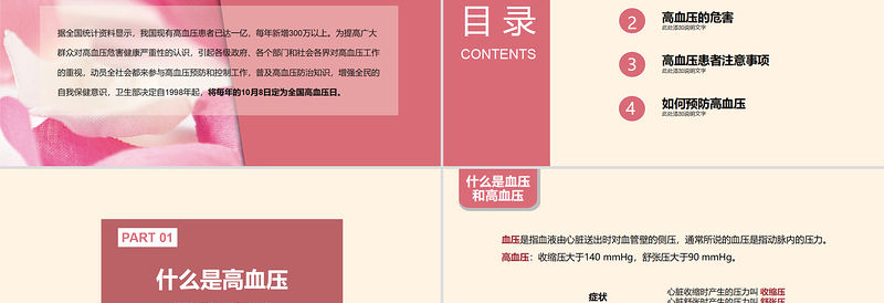 目 錄CONTENTS什么是高血壓 此處添加說明文字高血壓的危害 此處添加說明文字高血壓患者注意事項 此處添加說明文字如何預防高血壓 此處添加說明文字