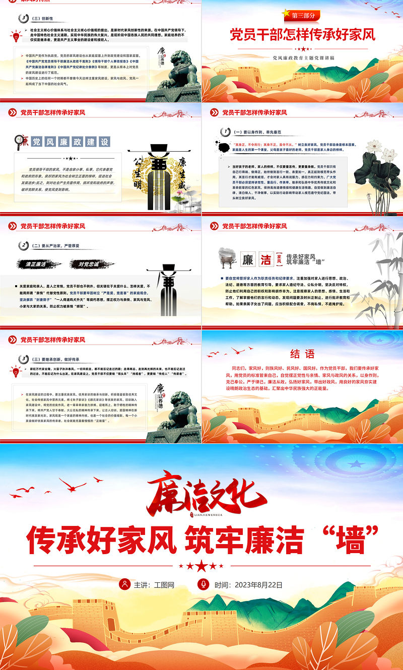 工圖網提供2023傳承好家風筑牢廉潔墻PPT精美大氣黨建風黨風廉政教育主題黨建黨課課件模板下載供會員免費下載。更多精彩黨課PPT素材,盡在工圖網。