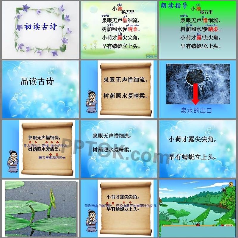 小池 楊萬里泉眼無聲/惜細流, 樹蔭照水/愛晴柔。 小荷才露/尖尖角, 早有蜻蜓/立上頭。chíquánxīyīnqíngróulù朗讀指導