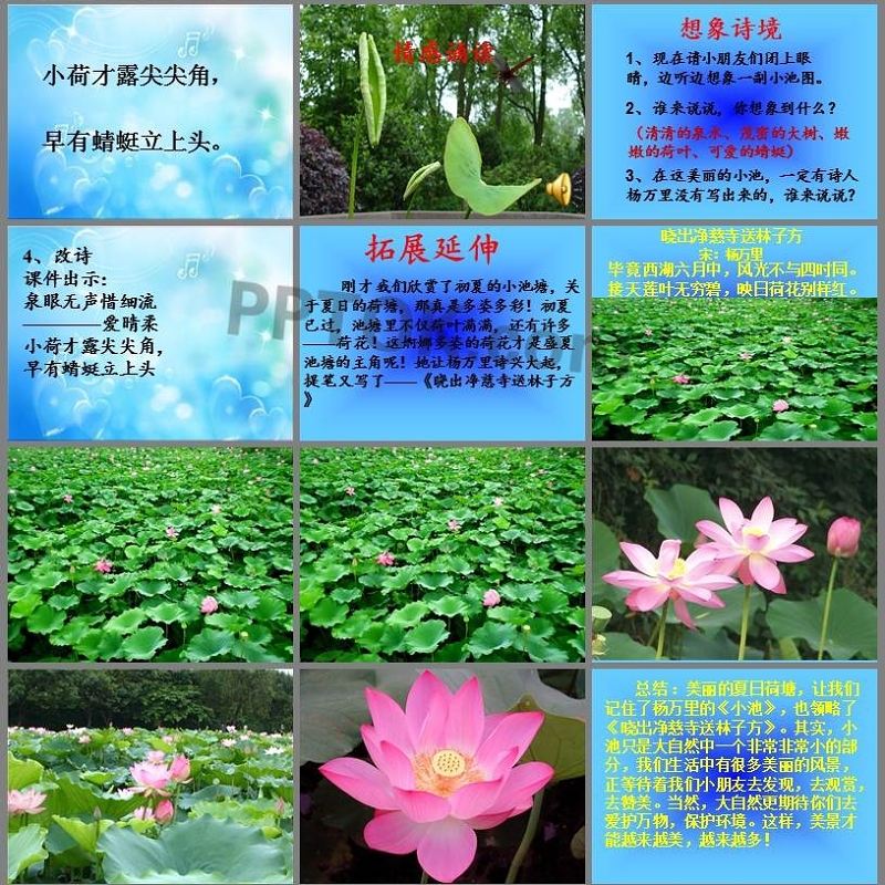 總結:美麗的夏日荷塘,讓我們記住了楊萬里的《小池》,也領略了《曉出凈慈寺送林子方》。其實,小池只是大自然中一個非常非常小的部分,我們生活中有很多美麗的風景,正等待著我們小朋友去發現,去觀賞,去贊美。當然,大自然更期待你們去愛護萬物,保護環境。這樣,美景才能越來越美,越來越多!