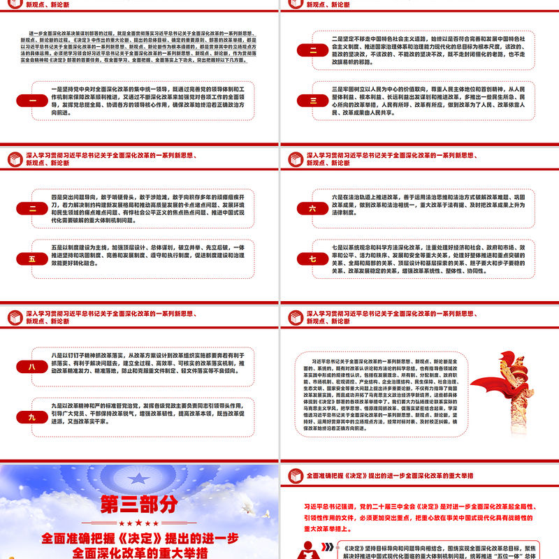深入學習貫徹習近平總書記關(guān)于全面深化改革的一系列新思想、新觀點、新論斷七是以系統(tǒng)觀念和科學方法深化改革,注重處理好經(jīng)濟和社會、政府和市場、效率和公平、活力和秩序、發(fā)展和安全等重大關(guān)系,處理好整體推進和重點突破的關(guān)系、全局和局部的關(guān)系、頂層設計和基層探索的關(guān)系、膽子要大和步子要穩(wěn)的關(guān)系、改革發(fā)展穩(wěn)定的關(guān)系,增強改革系統(tǒng)性、整體性、協(xié)同性。七六是在法治軌道上推進改革,善于運用法治思維和法治方式破解改革難題、鞏固改革成果,做到改革和法治相統(tǒng)一,重大改革于法有據(jù)、及時把改革成果上升為法律制度。六