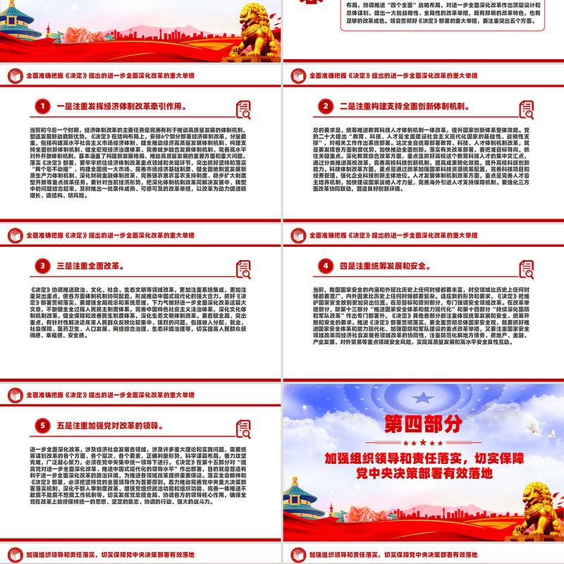 全面準確把握《決定》提出的進一步全面深化改革的重大舉措三是注重全面改革。3《決定》協(xié)調(diào)推進政治、文化、社會、生態(tài)文明等領(lǐng)域改革,更加注重系統(tǒng)集成,更加注重突出重點,使各方面體制機制協(xié)同配套,形成推動中國式現(xiàn)代化的強大合力。抓好《決定》部署貫徹落實,要增強全局觀念和系統(tǒng)思維,下力氣做好進一步全面深化改革這篇大文章,不斷健全全過程人民民主制度體系,完善中國特色社會主義法治體系,深化文化體制機制改革,健全保障和改善民生制度體系,深化生態(tài)文明體制改革。要著眼全局、突出重點,有針對性解決近年來人民群眾反映比較集中、強烈的問題,包括收入分配、就業(yè)、社會保障、醫(yī)藥衛(wèi)生、人口發(fā)展、網(wǎng)絡綜合治理、生態(tài)環(huán)境治理等,切實提高人民群眾獲得感、幸福感、安全感。