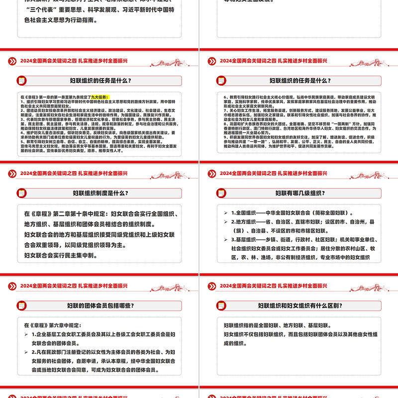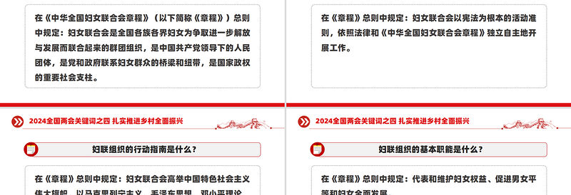 婦聯組織的性質是什么?在《中華全國婦女聯合會章程》(以下簡稱《章程》)總則中規定:婦女聯合會是全國各族各界婦女為爭取進一步解放與發展而聯合起來的群團組織,是中國共產黨領導下的人民團體,是黨和政府聯系婦女群眾的橋梁和紐帶,是國家政權的重要社會支柱。2024全國兩會關鍵詞之四 扎實推進鄉村全面振興