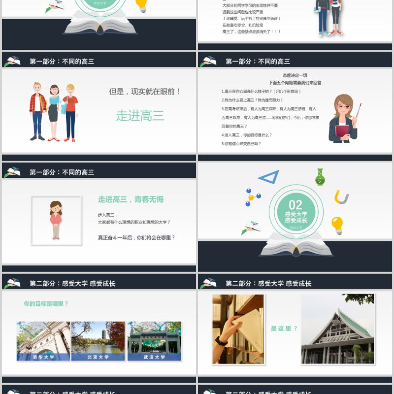 走進高三,青春無悔步入高三,大家都有什么理想的職業和理想的大學?真正奮斗一年后,你們將會在哪里?第一部分:不同的高三