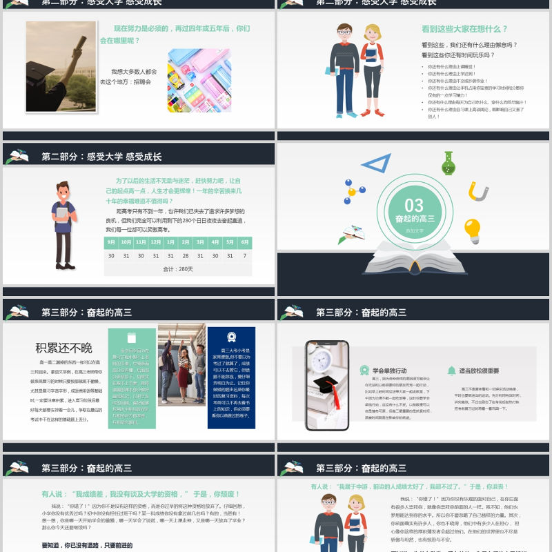 為了以后的生活不無助與迷茫,趕快努力吧,讓自己的起點高一點,人生才會更輝煌!一年的辛苦換來幾十年的幸福難道不值得嗎? 距高考只有不到一年,也許我們已失去了追求許多夢想的良機,但我們完全可以利用剩下的280個日日夜夜去奮起直追,我們每一位都可以笑傲高考。第二部分:感受大學 感受成長