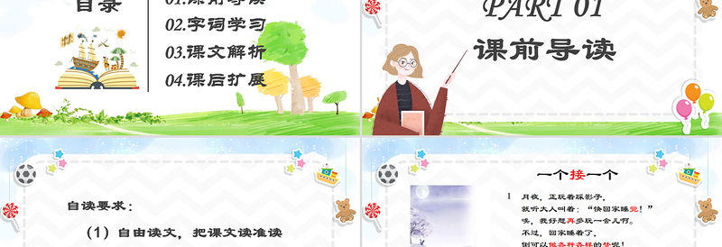 一個接一個月夜,正玩著踩影子,就聽大人叫著:“快回家睡覺!”唉,我好想再多玩一會兒啊。不過,回家睡著了,倒可以做各種各樣的夢呢!?正做著好夢,又聽見大人在叫:“該起床上學(xué)啦!”唉,要是不上學(xué)就好了。不過,去了學(xué)校,就能見到小伙伴,多么開心哪!12