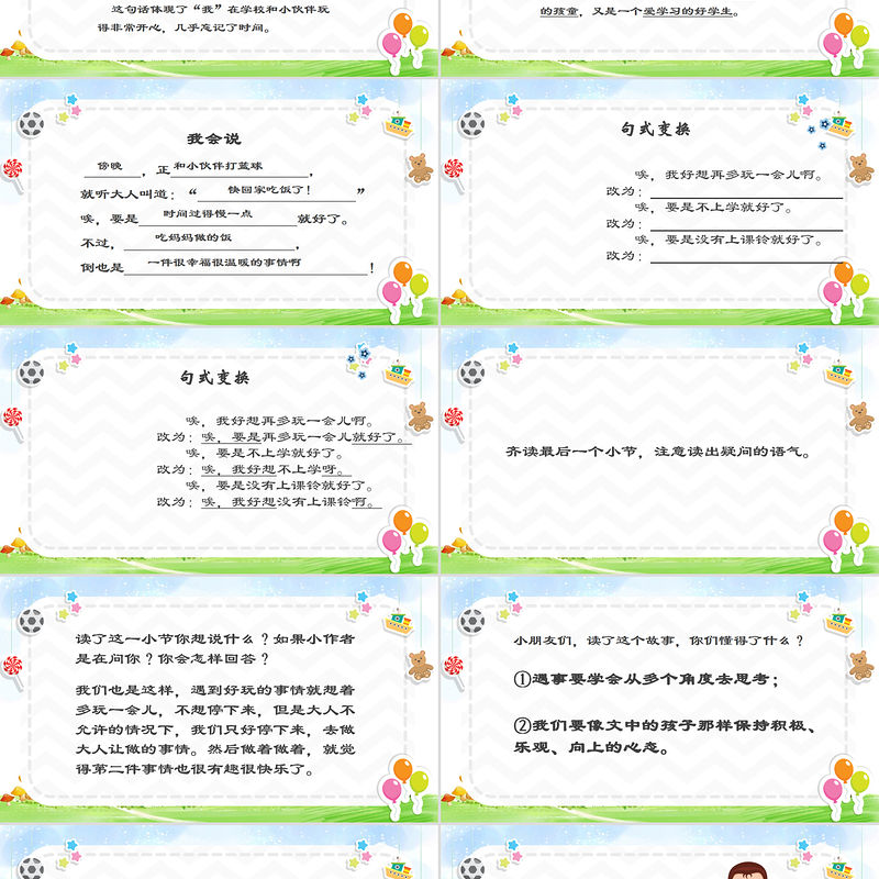 正 和 小 伙 伴 們 玩 著 跳 房 子, 操 場 上 卻 響 起 了 上 課 鈴 聲。 唉,要 是 沒 有 上 課 鈴 就 好 了。zhènɡ hé xiǎo huǒ bàn men wán zhe tiào fánɡ zi cāo chǎnɡ shànɡ què xiǎnɡ qǐ le shànɡ kè línɡ shēnɡ ài yào shì méi yǒu shànɡ kè línɡ jiù hǎo le思考:這句話體現(xiàn)了什么? 這句話體現(xiàn)了“我”在學(xué)校和小伙伴玩得非常開心,幾乎忘記了時間。