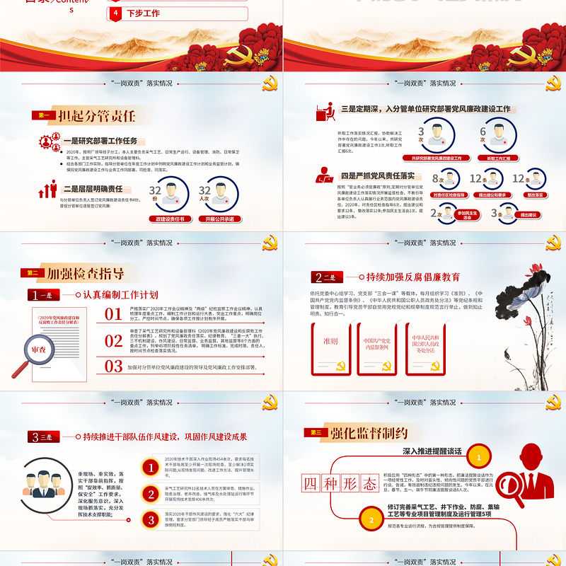 加強檢查指導第二《2020年黨風廉政建設和 反腐敗工作責任分解表》審查01嚴格落實廠2020年工作會議精神及“兩級”紀檢監察工作會議精神,認真梳理年度重點工作,編制工作計劃和運行大表,突出工作重點,明確崗位分工,嚴控時間節點,確保各項工作按計劃有序開展。02審查了采氣工藝研究所和設備管理科《2020年黨風廉政建設和反腐敗工作責任分解表》,規劃了黨風廉政責任落實、紀律教育、“三重一大”執行、三不機制建設、作風建設、日常監督、業務監督、其他監督等8個方面的重點工作,列舉45項階段性任務清單, 明確工作標準、完成時限、責任人,按時間節點檢查落實情況。03加強對分管單位黨風廉政建設的領導及黨風廉政工作安排部署。“一崗雙責”落實情況