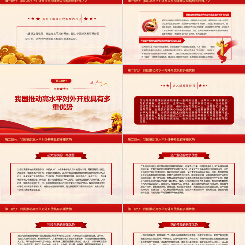 一百年風(fēng)雨兼程,我國探索出了一條適合中國國情的發(fā)展道路,積累了發(fā)展經(jīng)驗(yàn),彰顯了制度優(yōu)勢。制度優(yōu)勢優(yōu)在黨的領(lǐng)導(dǎo)、舉旗定向。辦好中國的事情,關(guān)鍵在黨。中國特色社會(huì)主義制度的最大優(yōu)勢是中國共產(chǎn)黨領(lǐng)導(dǎo),可以集中力量辦大事,著眼長遠(yuǎn)謀劃發(fā)展。制度優(yōu)勢優(yōu)在人民至上、以人民為中心。以人民為中心,是我們一切工作的出發(fā)點(diǎn)和落腳點(diǎn),也是我們黨區(qū)別于其他政黨的顯著標(biāo)志。制度優(yōu)勢優(yōu)在團(tuán)結(jié)一致、勠力同心。面對突如其來的新冠肺炎疫情,以習(xí)近平同志為核心的黨中央統(tǒng)攬全局、果斷決策,以非常之舉應(yīng)對非常之事,堅(jiān)持把人民生命安全和身體健康放在第一位,統(tǒng)籌推進(jìn)疫情防控和經(jīng)濟(jì)社會(huì)發(fā)展,我國經(jīng)濟(jì)率先復(fù)蘇,在全球主要經(jīng)濟(jì)體中一枝獨(dú)秀。黨的堅(jiān)強(qiáng)領(lǐng)導(dǎo)是我們的最大底氣,集中力量辦大事的制度優(yōu)勢是我們的制勝法寶,為推動(dòng)高水平對外開放提供了根本保障。第二部分:我國推動(dòng)高水平對外開放具有多重優(yōu)勢