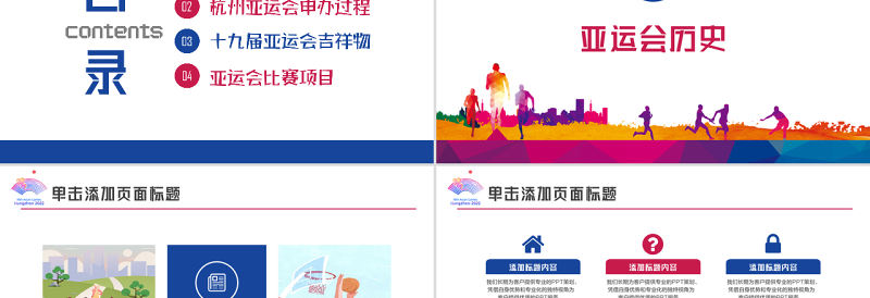 目 錄01亞運會歷史02杭州亞運會申辦過程03十九屆亞運會吉祥物04亞運會比賽項目contents