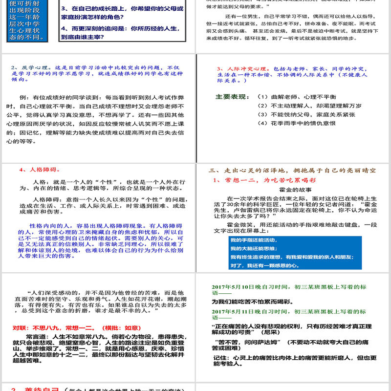 3、人際沖突心理。包括與老師、家長、同學的沖突,生活在一種不和諧、不協調的人際關系中(不健康人際關系。)主要表現:(1)曲解老師、心理不平衡 (2)不主動理解人,卻渴望理解萬歲 (3)不能悅納父母,家庭關系緊張 (4)花季雨季中的情仇意恨