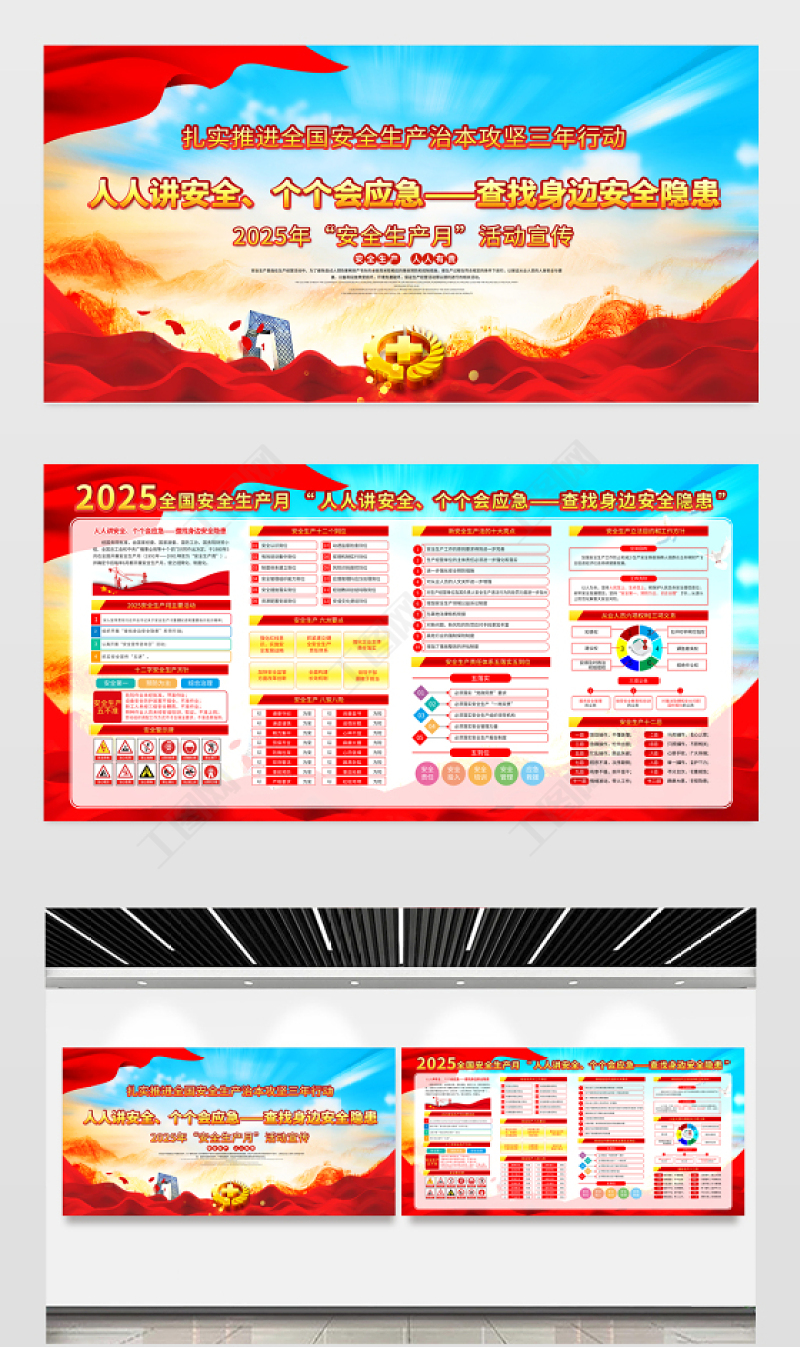 2025全國安全生產月掛圖精美紅色查找身邊安全隱患宣傳教育活動展板掛畫設計模板包含