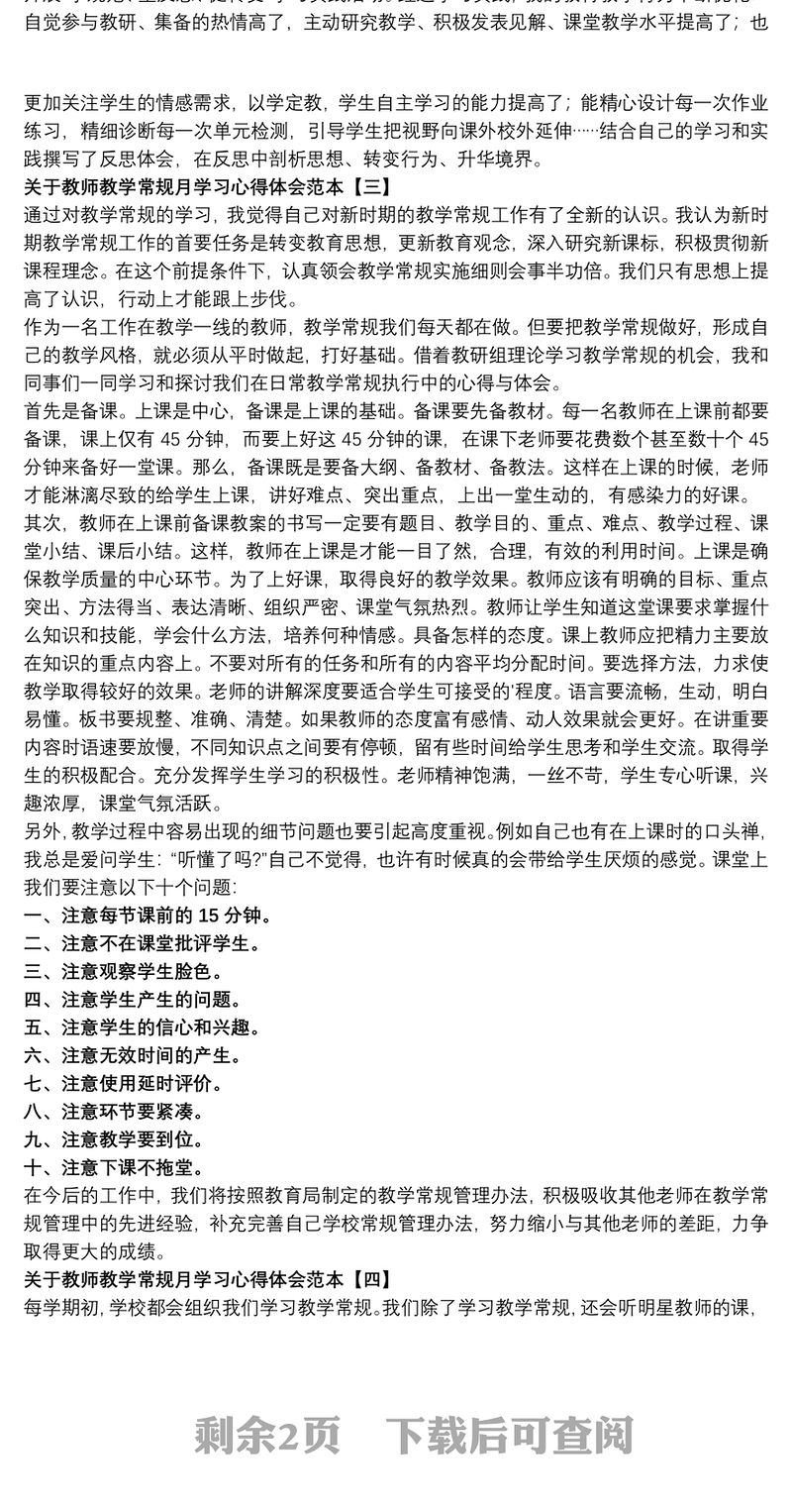 關于教師教學常規月學習心得體會范本