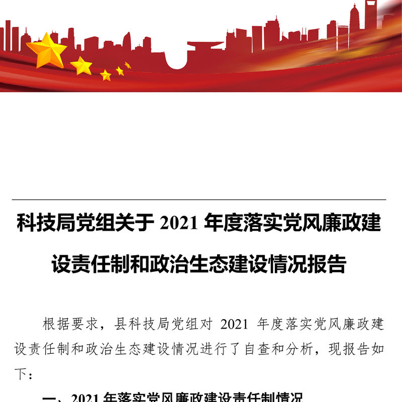 工圖網(wǎng)提供科技局黨組關于2021年度落實黨風廉政建設責任制和政治生態(tài)建設情況報告供會員免費下載。更多精彩黨課PPT素材,盡在工圖網(wǎng)。