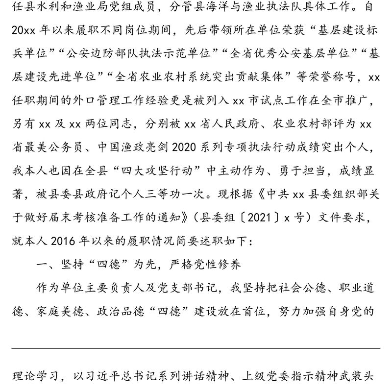 領導干部五年述職述責述德述廉述法報告范文(水利和漁業局黨組成員),述職述責述德述廉述法報告,公文范文 Array