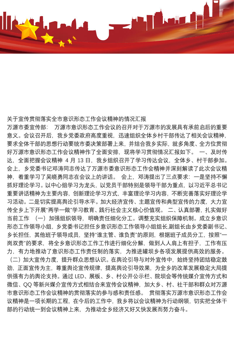 公文范文 > 關于宣傳貫徹落實全市意識形態工作會議精神的情況匯報.DOCX