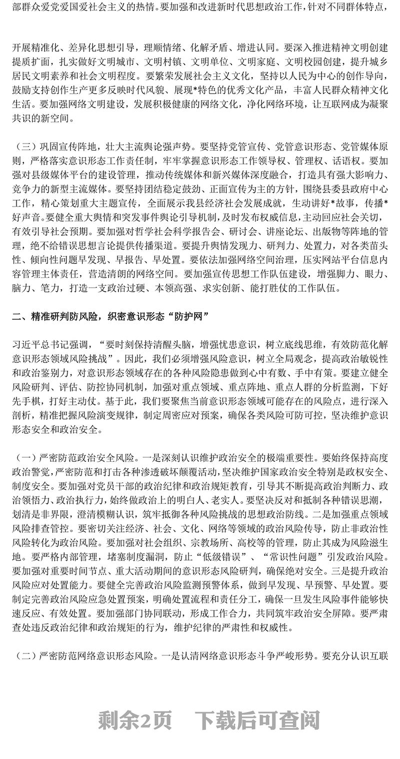 > 黨政風高舉思想旗幟筑牢安全防線PPT全面提升新時代意識形態工作質效黨課(講稿).DOCX