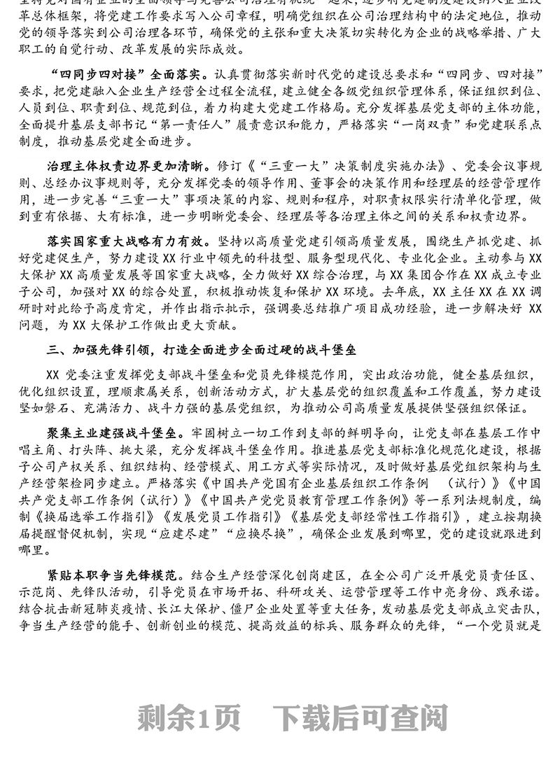 2022年國企黨建工作方向和思路2022有事好商量工作經(jīng)驗交流材料在全市平安建設(shè)工作經(jīng)驗交流會上的發(fā)言材料20212022關(guān)于國有企業(yè)改革發(fā)展和黨的建設(shè)重要論述精神心得提綱2021黨課國企改革發(fā)展和黨的建設(shè)的重要論述2021關(guān)于國有企業(yè)改革發(fā)展和黨的建設(shè)發(fā)言材料國企黨建黨課講稿2022學(xué)習(xí)關(guān)于國有企業(yè)改革發(fā)展和黨的建設(shè)心得體會2022國企黨建品牌創(chuàng)建工作方案2021加強黨建與生產(chǎn)經(jīng)營融合促進(jìn)國有企業(yè)高質(zhì)量發(fā)展2023關(guān)于加強國企黨建工作總結(jié)2023國企黨建宣傳思想工作總結(jié)2023國企黨建工作概述總結(jié)2023國企黨建促融合工作總結(jié)2023國企黨建總結(jié)