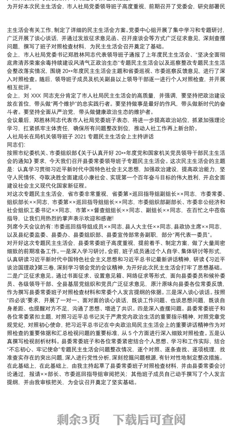 工圖網提供人社局長在局機關領導班子2021專題民主生活會上主持講話供會員免費下載。更多精彩黨課PPT素材,盡在工圖網。