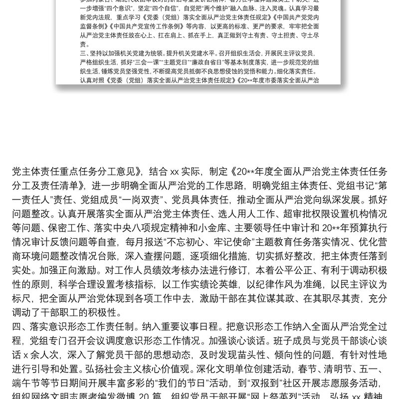 2021落實全面從嚴治黨主體責任年度任務安排2021貫徹落實《黨委(黨組)落實全面從嚴治黨主體責任規定》 自查報告2022年個人落實全面從嚴治黨主體責任情況報告部機關2022年落實全面從嚴治黨主體責任暨黨風廉政建設和反腐敗工作情況報告2021人大機關落實全面從嚴治黨主體責任情況報告2021年黨員領導干部落實全面從嚴治黨主體責任的情況報告2021辦公室主任落實全面從嚴治黨主體責任情況報告2022醫院落實全面從嚴治黨主體責任2021年度黨委落實全面從嚴治黨主體責任報告2022縣婦聯落實全面從嚴治黨主體責任情況報告2022落實全面從嚴治黨主體責任支部主要負責人落實第一責任人情況報告2023全面從嚴治黨制度從嚴治黨2022派出所落實全面從嚴治黨主體責任工作報告2023如何落實全面從嚴治黨總結