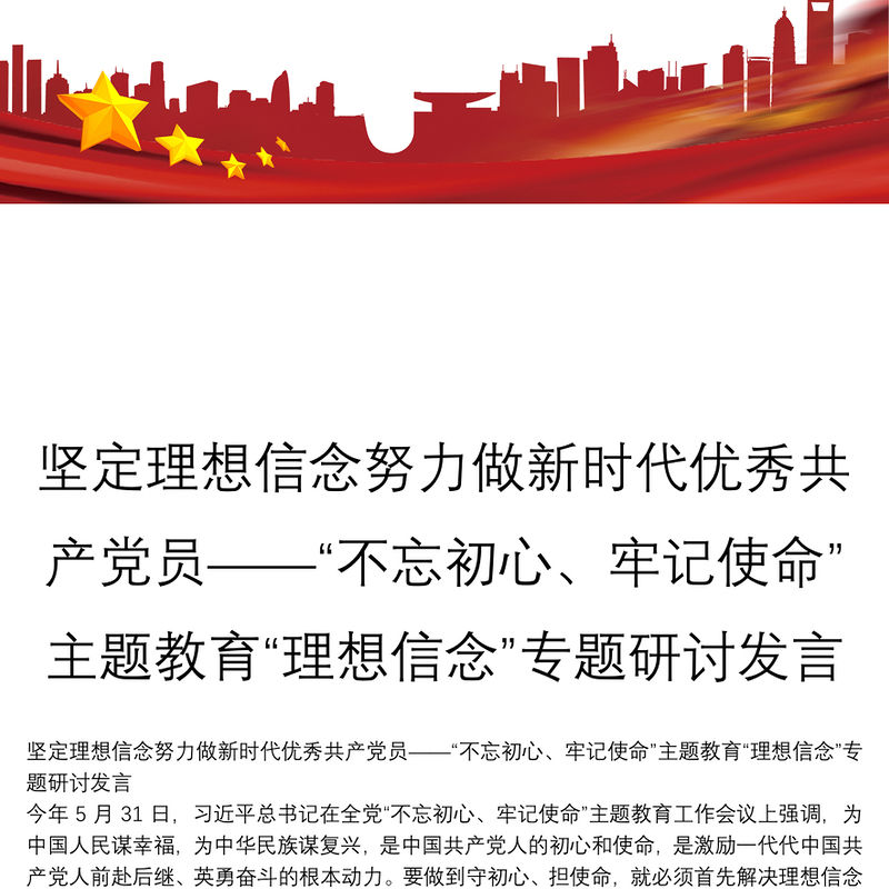 工圖網提供堅定理想信念努力做新時代優秀共產黨員——“不忘初心、牢記使命”主題教育“理想信念”專題研討發言供會員免費下載。更多精彩黨課PPT素材,盡在工圖網。