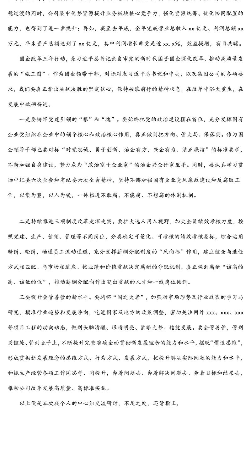國企總經理中心組學習研討發言材料(國企改革三年行動)