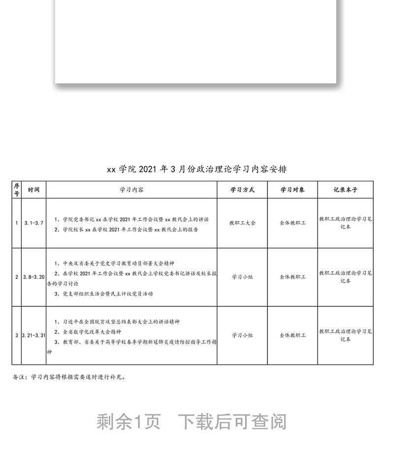 xx市xx中學(xué)2021年第一季度政治理論學(xué)習(xí)安排表,政治理論學(xué)習(xí),素材資料 Array