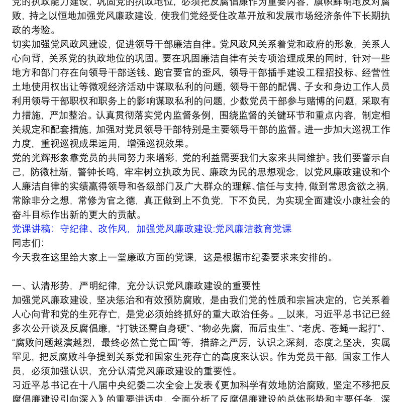 黨課講稿:守紀律、改作風,加強黨風廉政建設:黨風廉潔教育黨課