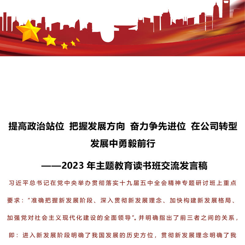 提高政治站位 把握發展方向 奮力爭先進位 在公司轉型發展中勇毅前行?——2023年主題教育讀書班交流發言稿