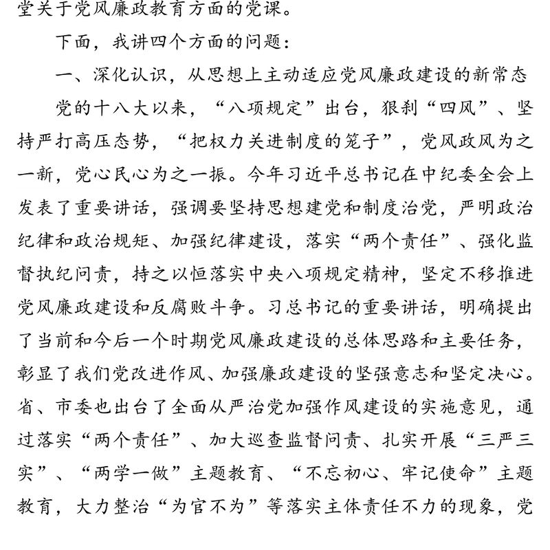 切實履行全面從嚴治黨主體責任推動形成風清氣正良好政治生態——在機關干部黨風廉政教育黨課會上的講稿(1),黨風廉政,公文 Array
