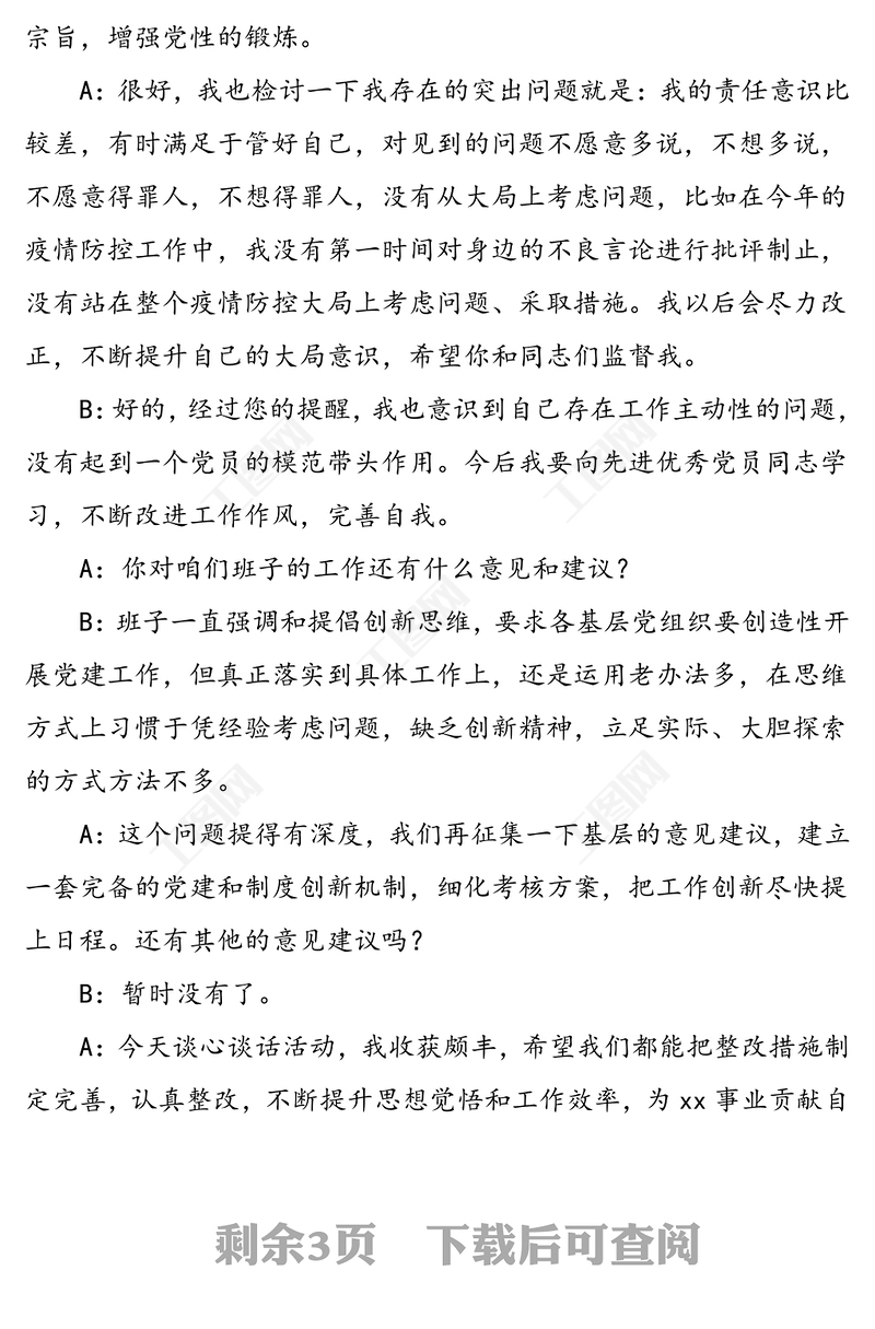 工圖網提供2篇談心談話記錄民主生活會組織生活會黨員談心談話記錄范文供會員免費下載。更多精彩黨課PPT素材,盡在工圖網。