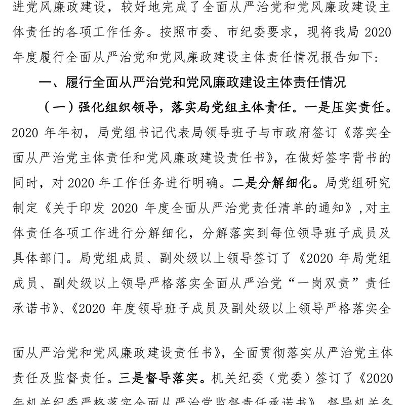 黨組2020年履行全面從嚴治黨和黨風廉政建設主體責任情況報告,黨風廉政建設主體責任情況報告,公文范文 Array