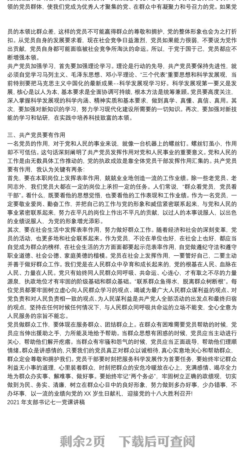 工圖網提供【2021年社區支部書記黨課講稿】2021年支部書記七一黨課講稿供會員免費下載。更多精彩黨課PPT素材,盡在工圖網。